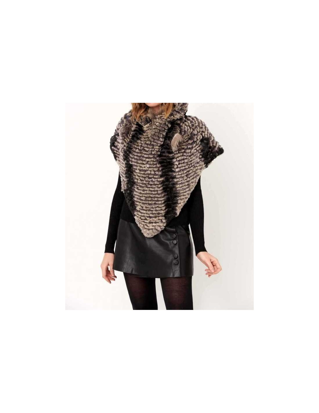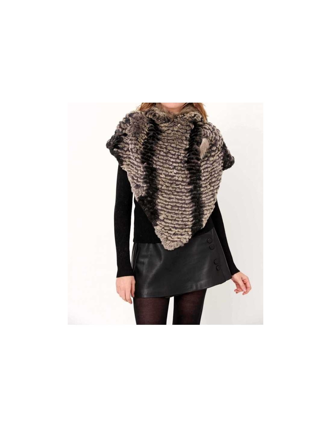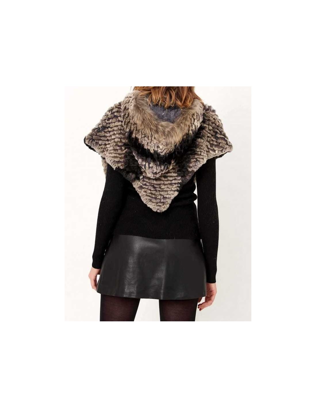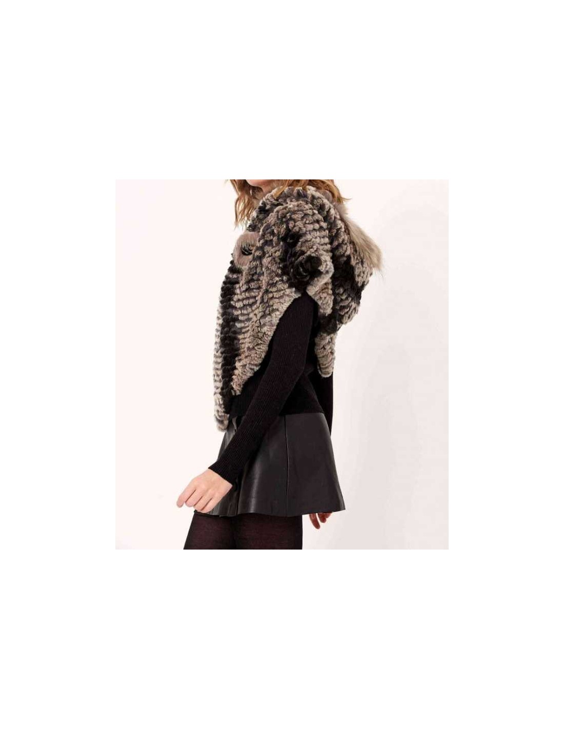 Poncho de pelo de conejo rex tricotado con capucha ribeteado de zorro