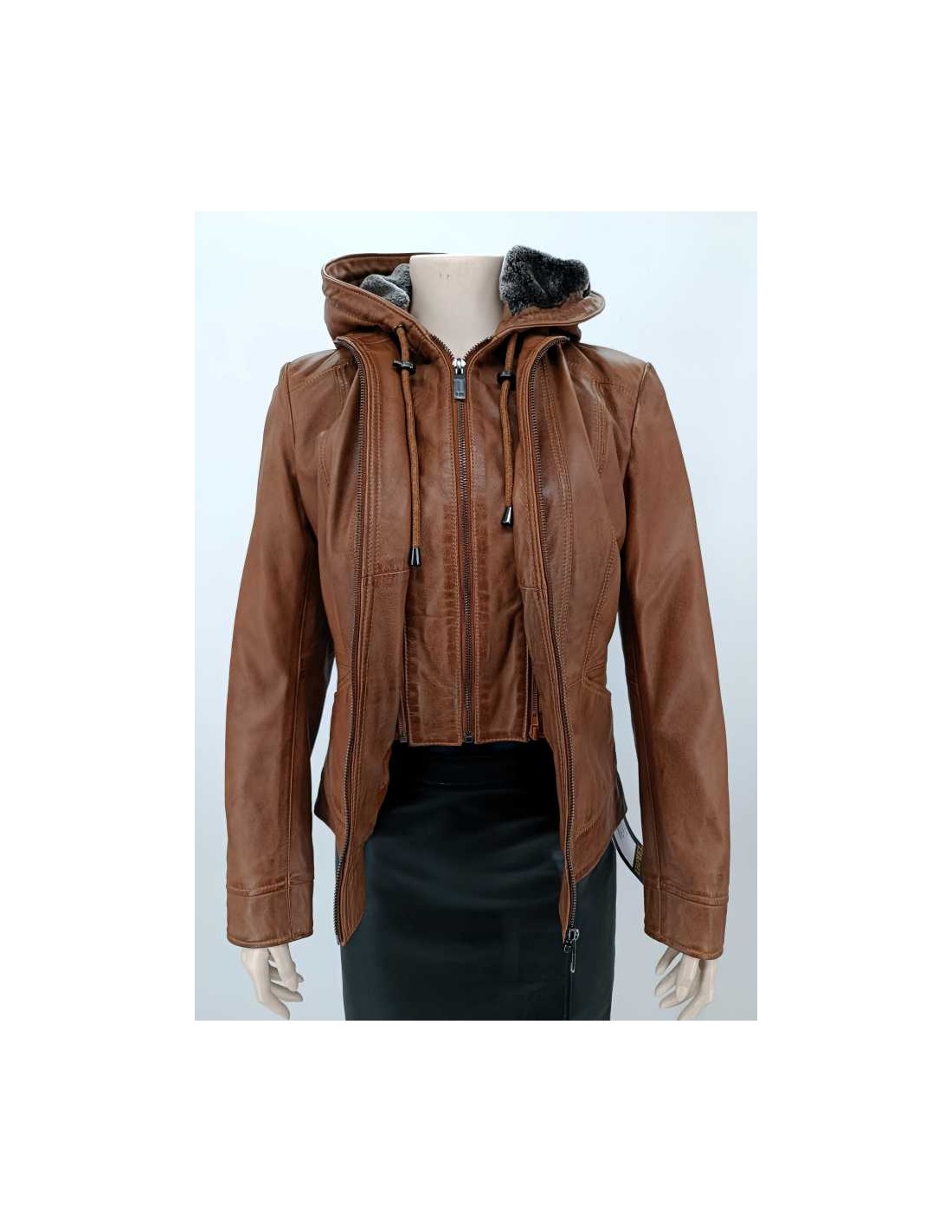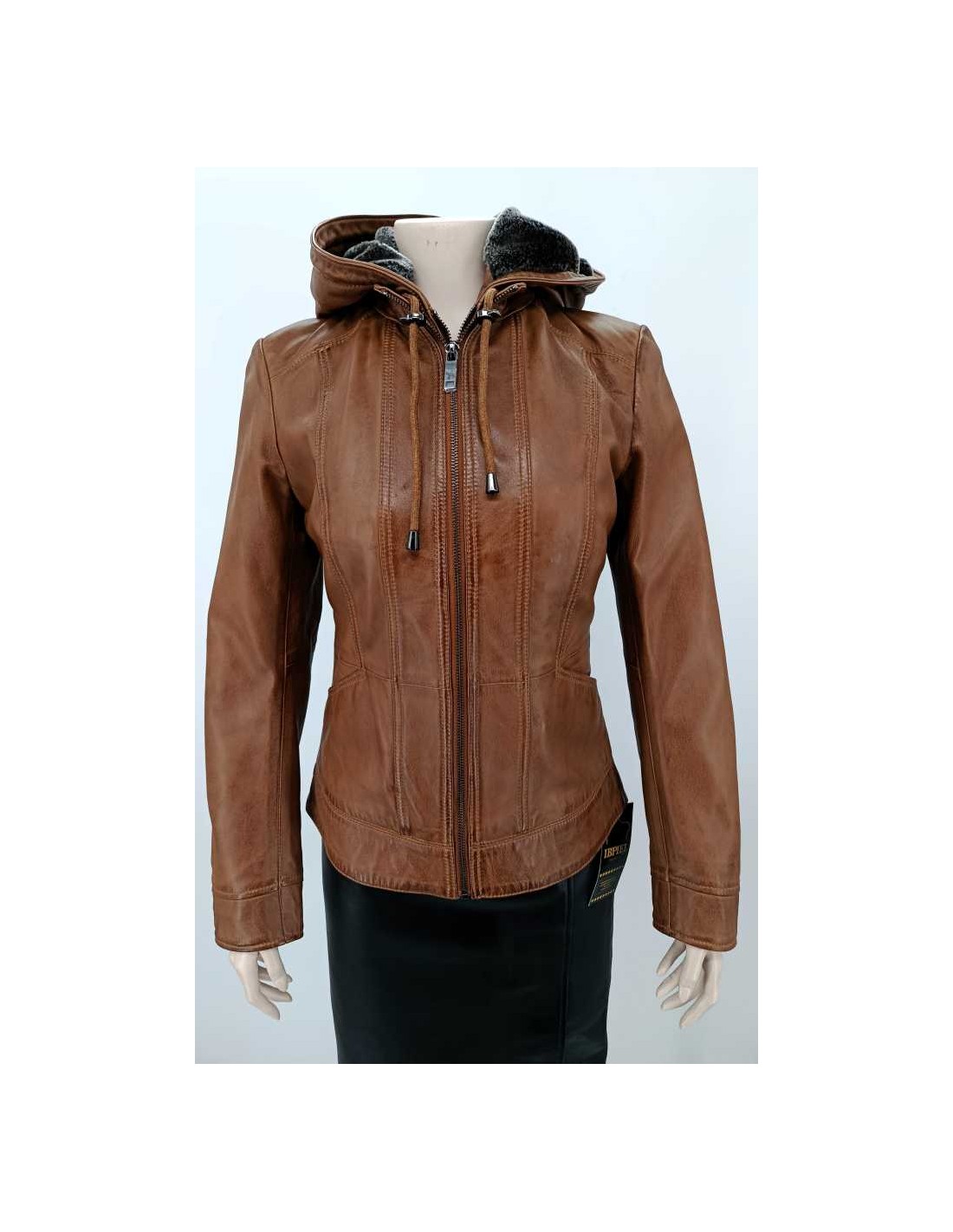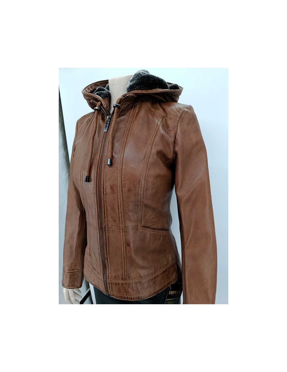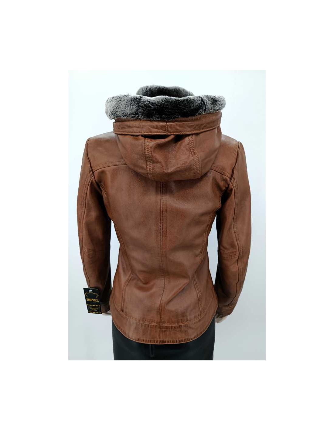 Cazadora de napa de cordero. Dispone de 2 bolsillos, para-vientos y capucha de pelo desmontable