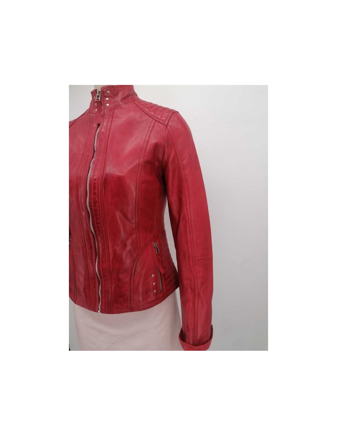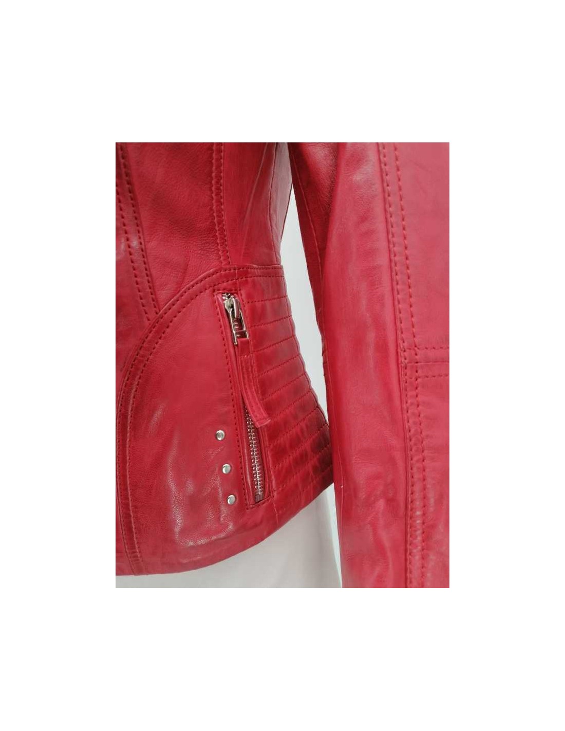 Cazadora de mujer en piel, adornos acolchados en hombros, tachuelas metálicas en cuello y bolsillos.