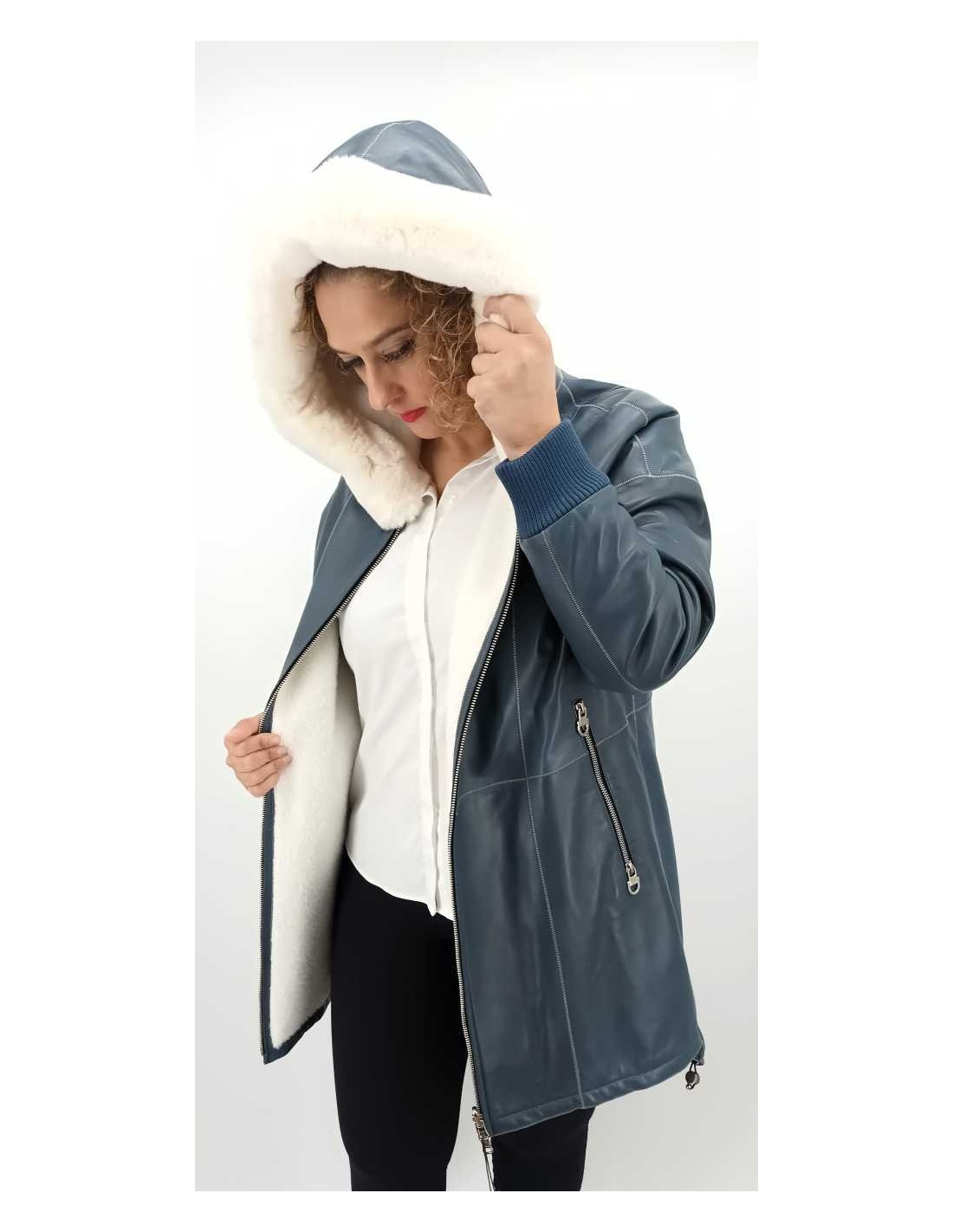 Gabardina Reversible con Capucha, Exterior de Piel en Color Azul e Interior en Alkantara Color Blanco, Capucha de Lomos de Rex