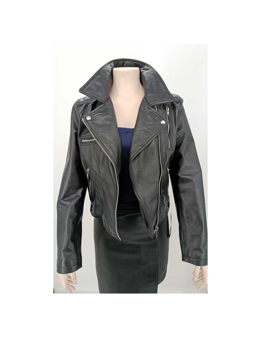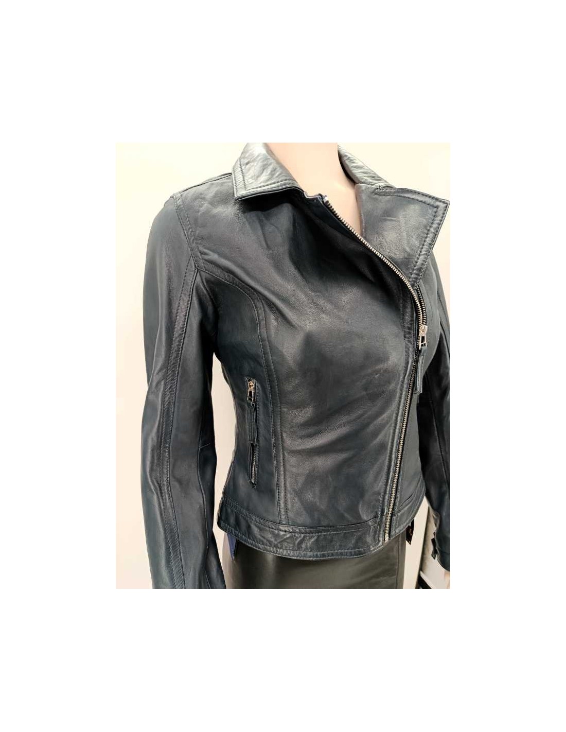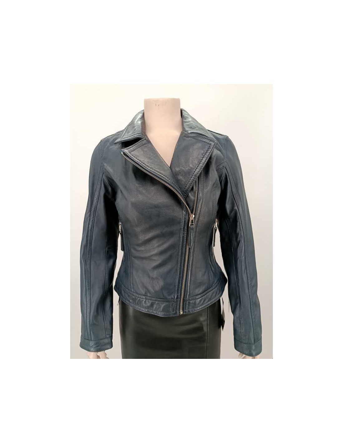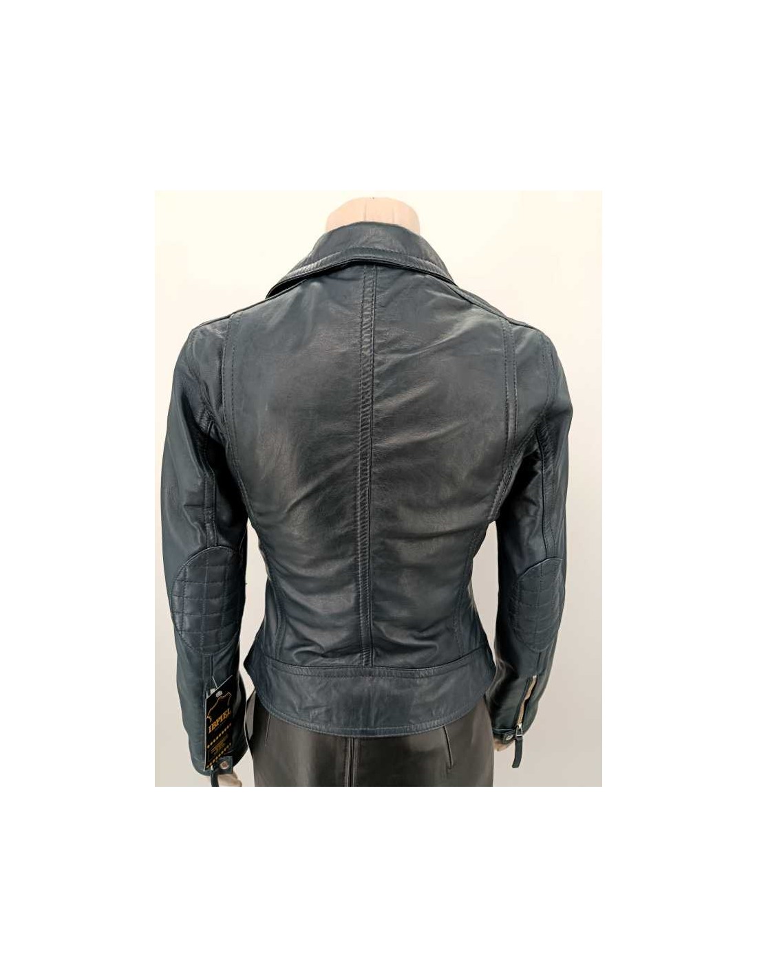 Cazadora de mujer entallada, cruzada con cremallera tipo " BIKER ", detalles acolchados en el codo.