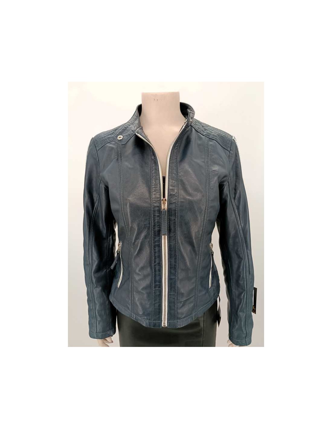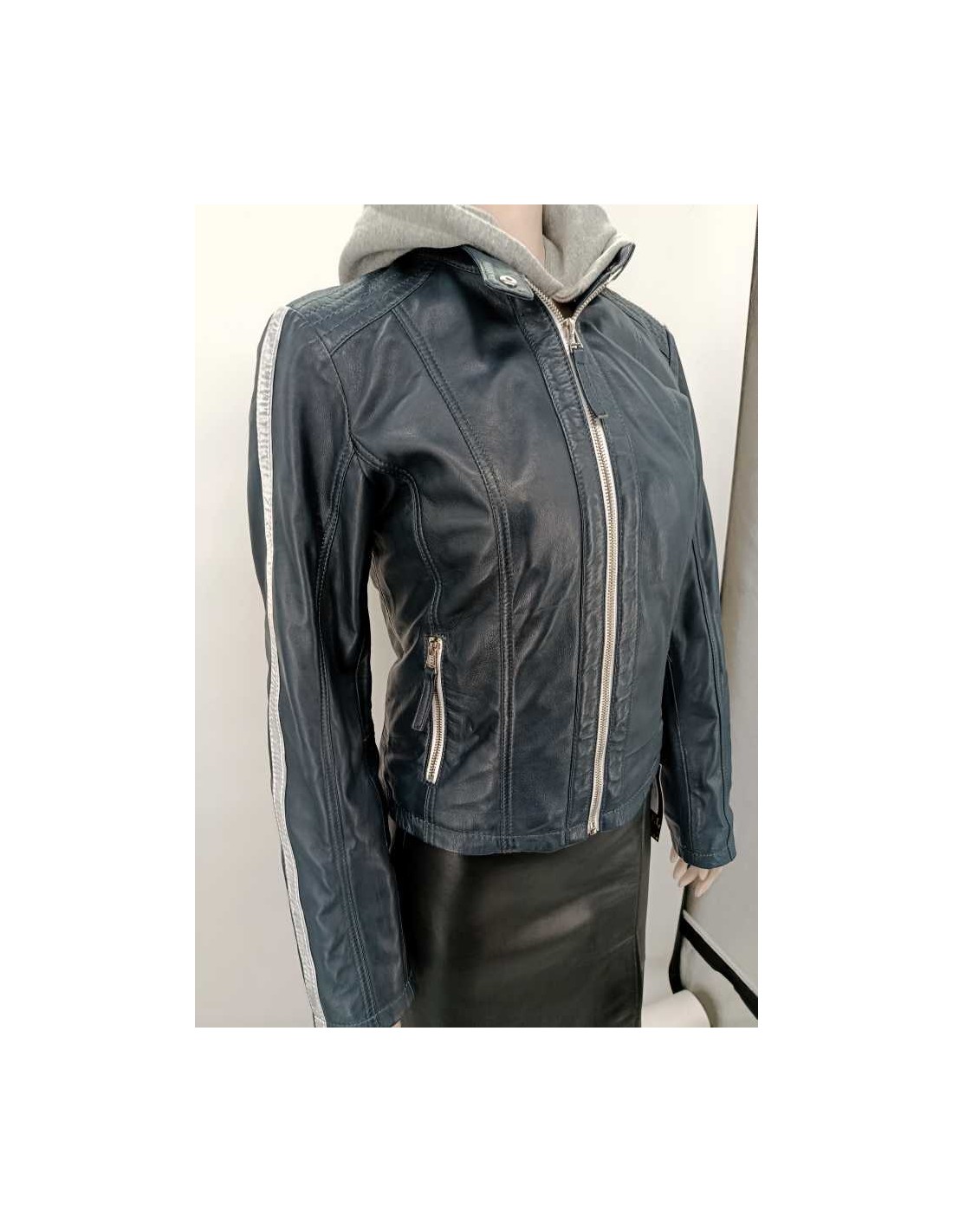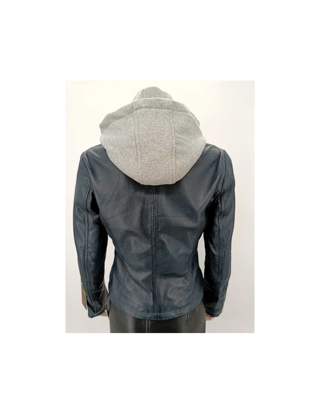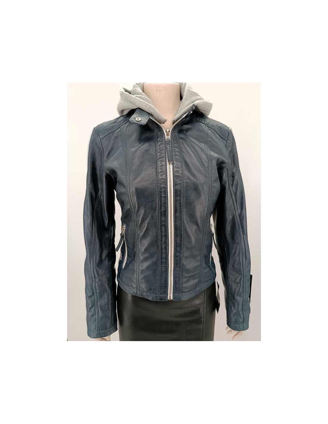 Cazadora de Piel con capucha de paño desmontable ( 100 % Natural ), Cremallera Central, bolsillos laterales con cremallera.