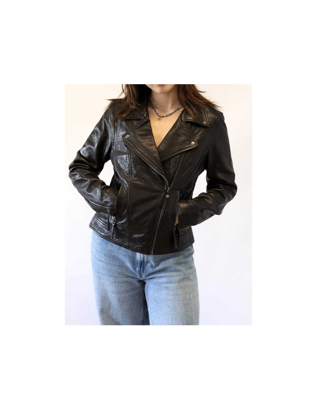Cazadora de piel calidad extra satinada ( 100 % Cordero ) entallada, tipo " Biker "