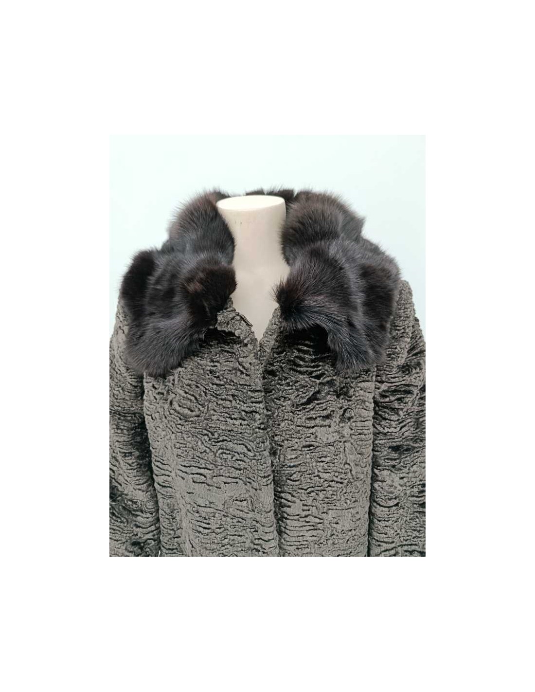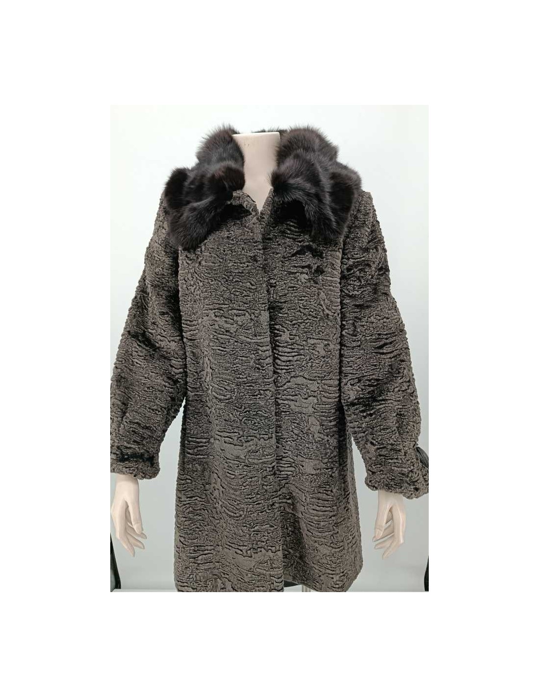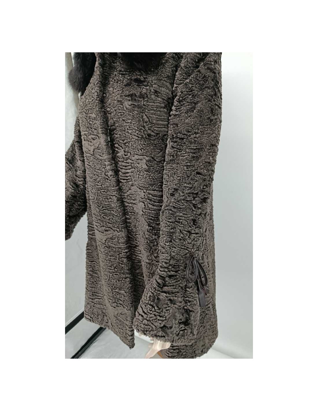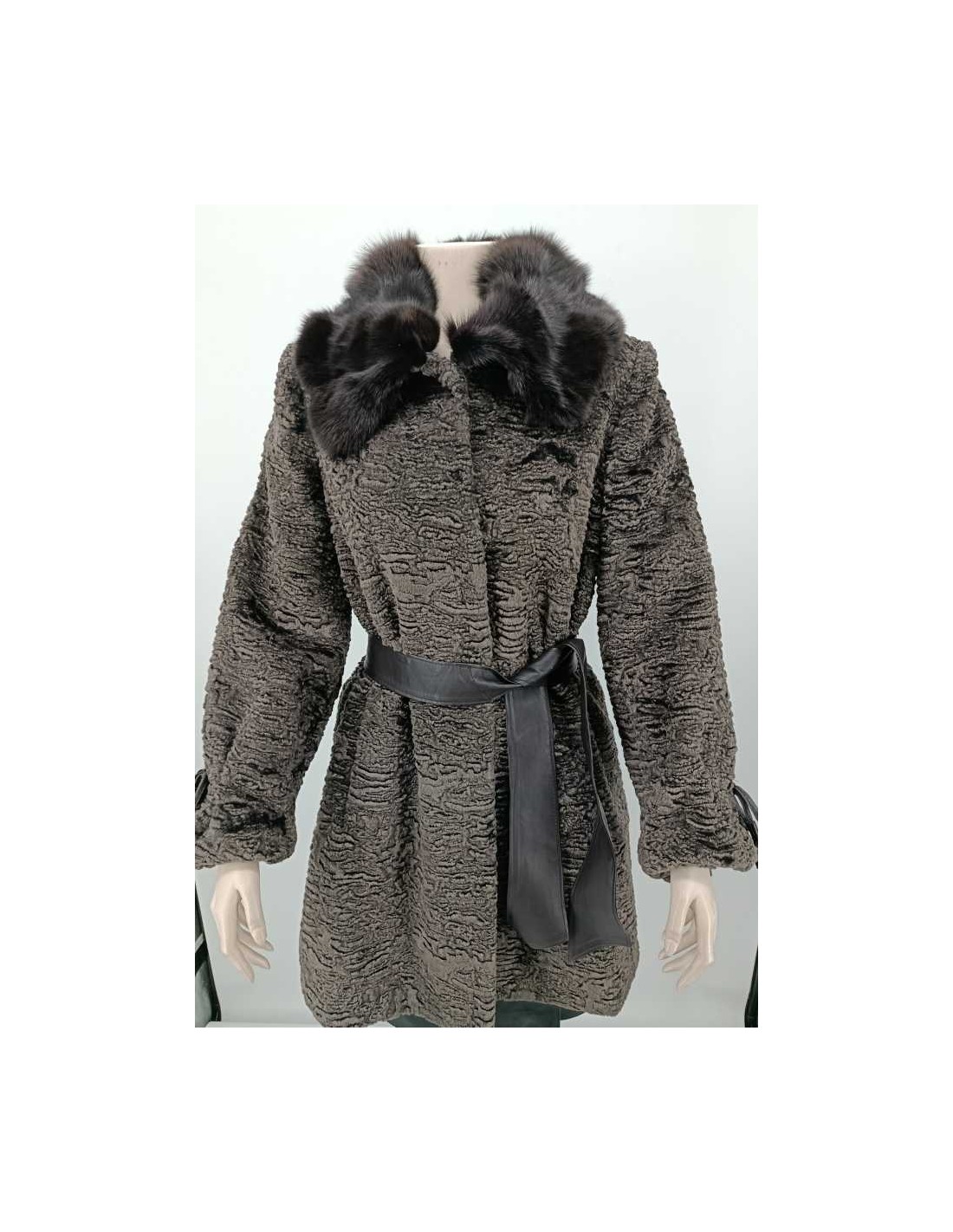 Abrigo de pelo sintético astracán con cuello de pelo de zorro natural, cinturón de piel, cierres de peletería, manga con detalle fruncido con lazo de piel.